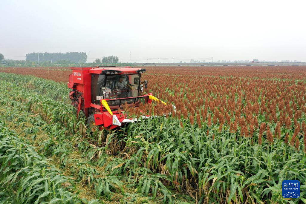 10月7日,在河北省邢臺(tái)市南和區(qū)和陽(yáng)鎮(zhèn)東關(guān)村,農(nóng)民駕駛收割機(jī)收獲高粱(無(wú)人機(jī)照片)。新華社記者 王曉 攝