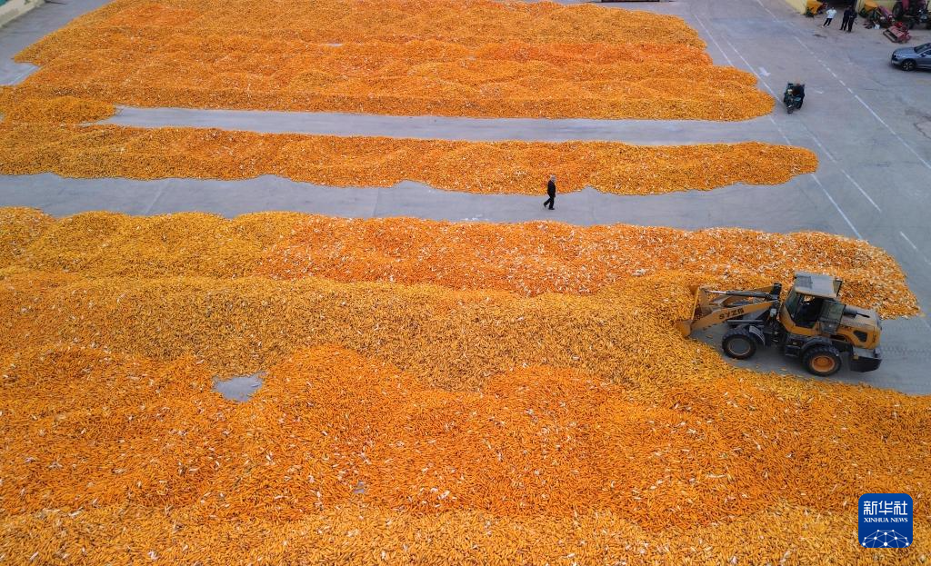 10月9日,在山東省臨邑縣德平鎮(zhèn),農(nóng)戶在晾曬剛收獲的玉米(無(wú)人機(jī)照片)。新華社記者 徐速繪 攝
