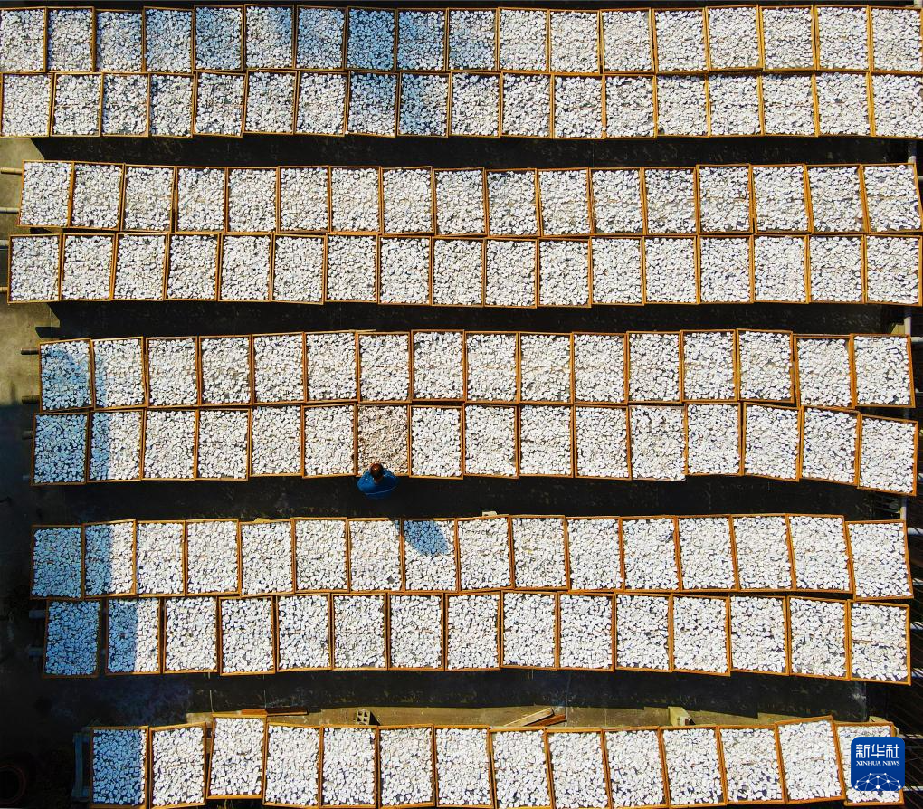 10月4日,在安徽省安慶市岳西縣響腸鎮(zhèn)千佛塔村,村民在曬茯苓(無(wú)人機(jī)照片)。新華社發(fā)(吳均奇攝)