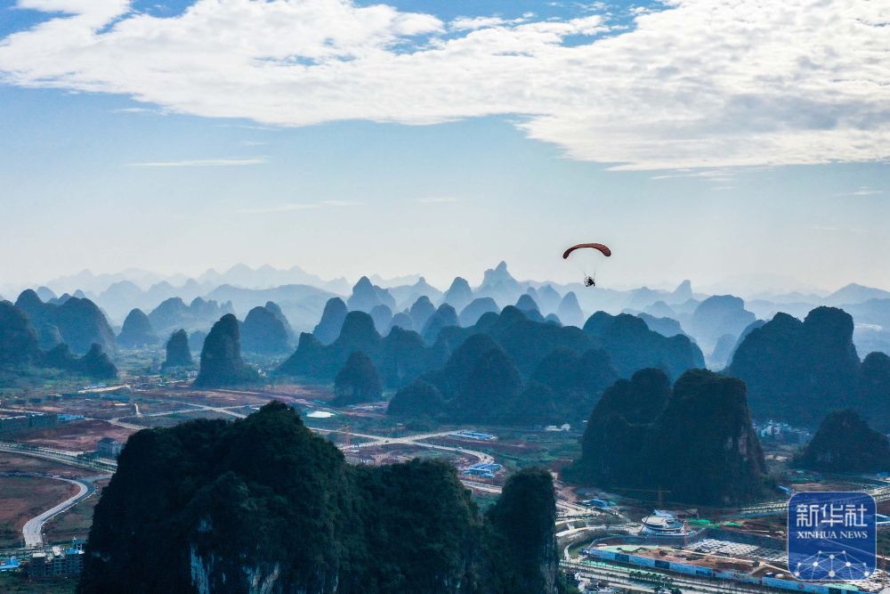 游客在廣西桂林市陽朔縣體驗動力滑翔傘(2019年11月14日攝,無人機(jī)照片)。 新華社記者 曹祎銘 攝