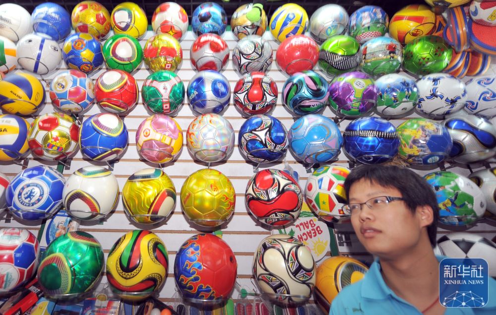 2010年6月23日,一位顧客正在浙江義烏小商品市場內(nèi)選購足球。據(jù)義烏海關(guān)統(tǒng)計,受南非世界杯帶動,當(dāng)?shù)伢w育用品的月度出口額連續(xù)半年超過1000萬美元,2010年前5個月的出口額比前一年同期增長110%。 新華社記者 王定昶 攝