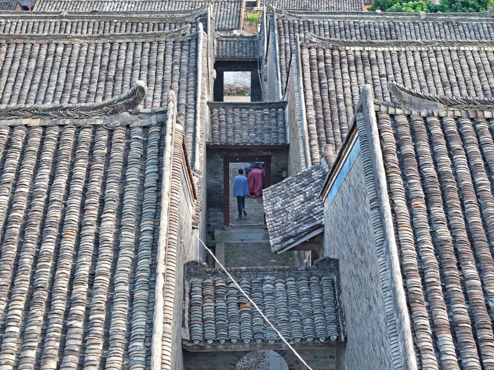 村民行走在廣西來(lái)賓市象州羅秀鎮(zhèn)納祿村的古巷中(10月9日攝,無(wú)人機(jī)照片)。