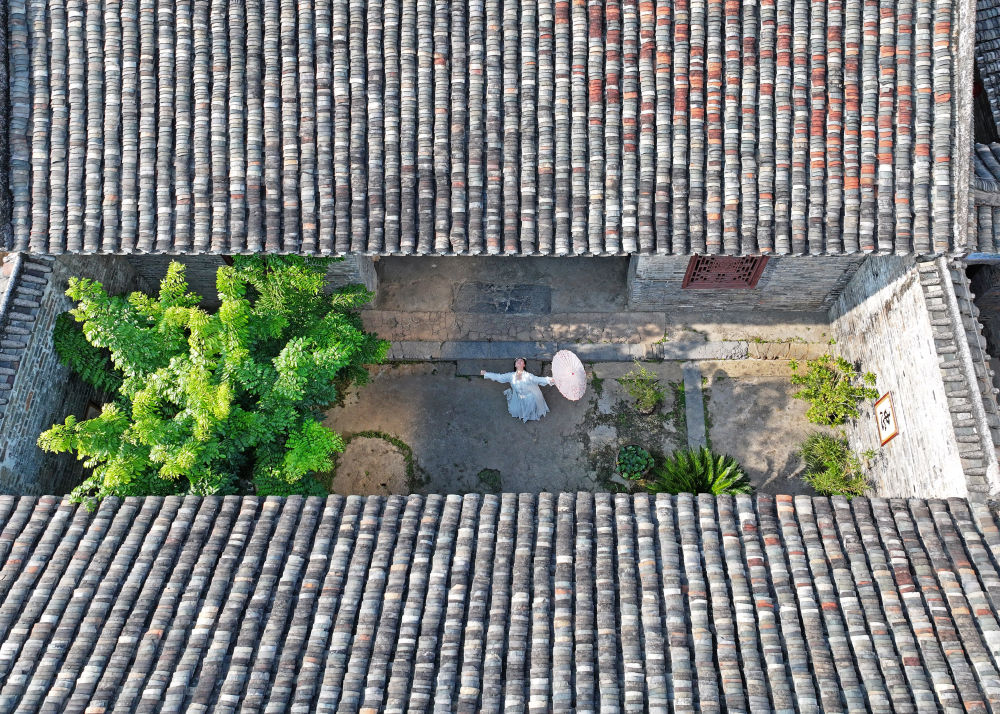 游客在廣西來(lái)賓市象州羅秀鎮(zhèn)納祿村的古宅中翩翩起舞(10月10日攝,無(wú)人機(jī)照片)。