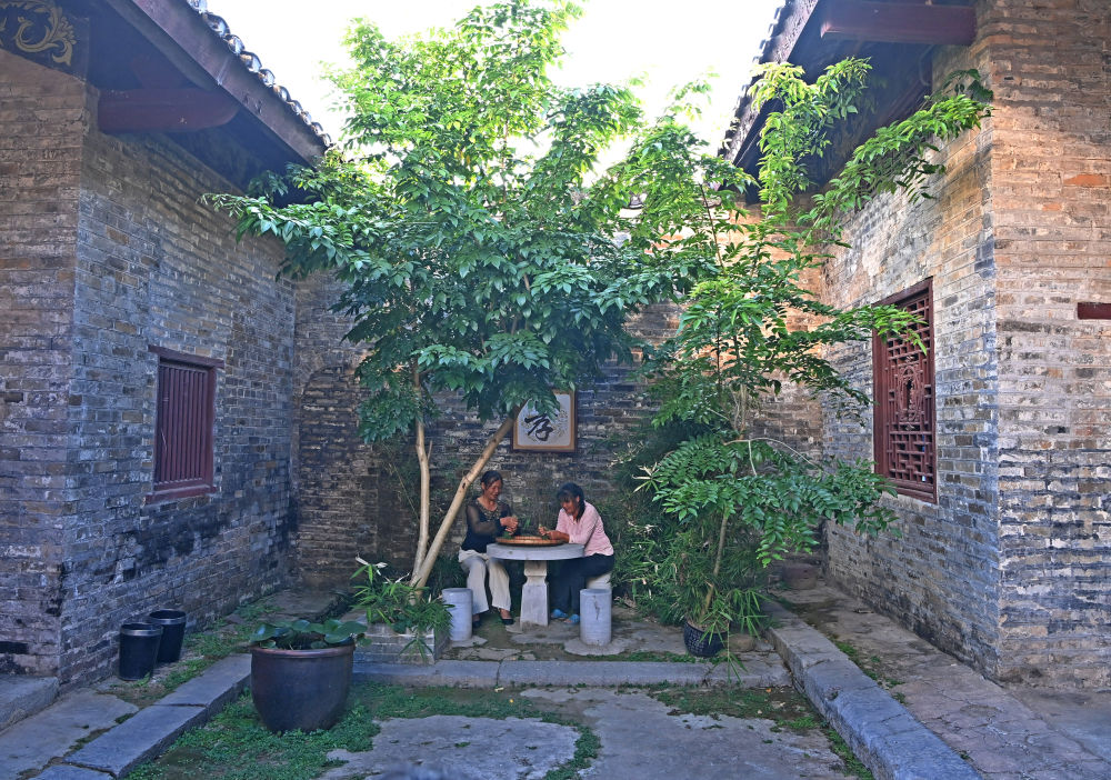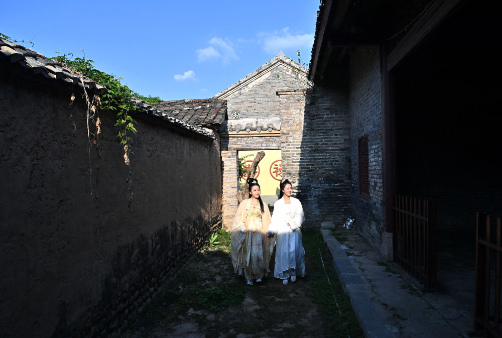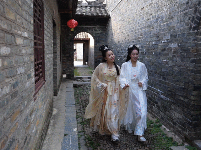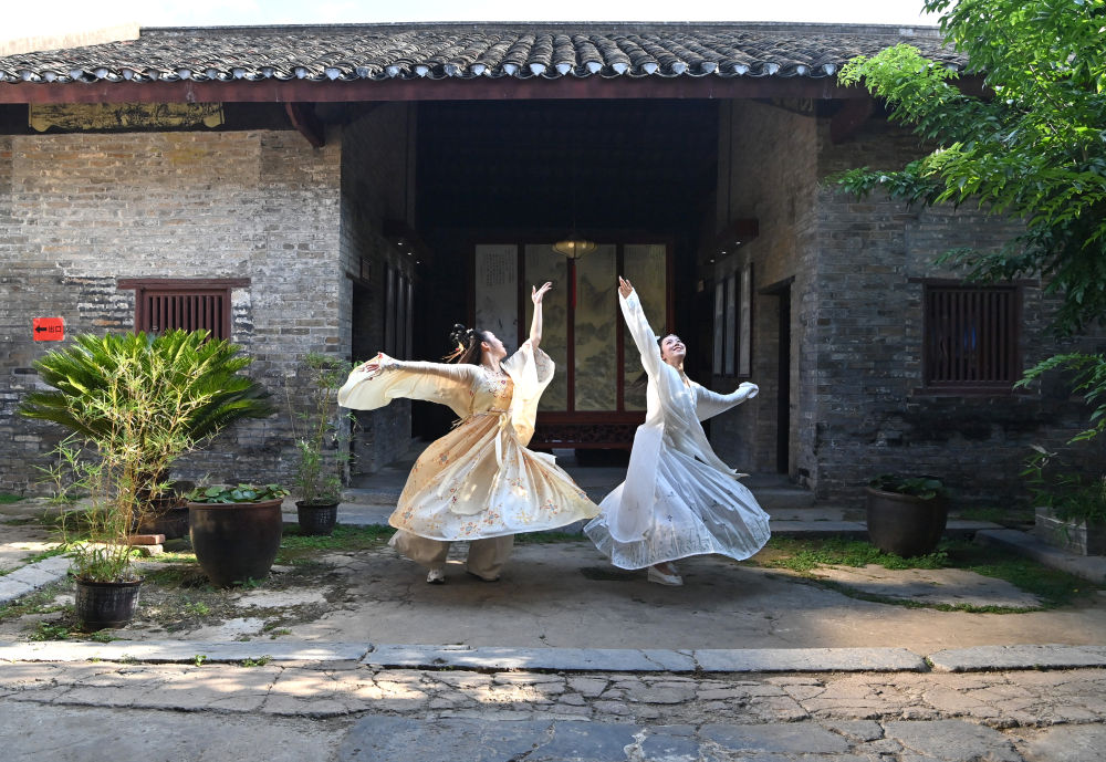 兩名游客在廣西來(lái)賓市象州羅秀鎮(zhèn)納祿村的古宅里翩翩起舞(10月10日攝)。