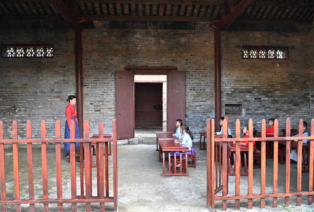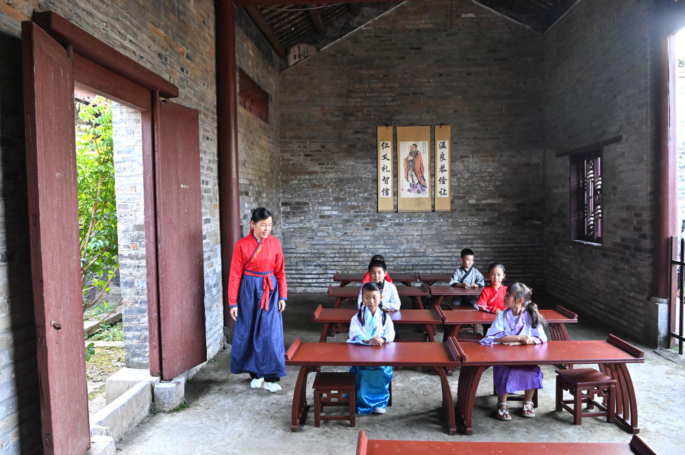 一名老師帶著幾名孩子在廣西來(lái)賓市象州羅秀鎮(zhèn)納祿村的古學(xué)堂里學(xué)習(xí)(10月10日攝)。