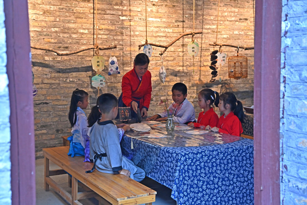 一名老師帶著幾名孩子在廣西來(lái)賓市象州羅秀鎮(zhèn)納祿村學(xué)習(xí)扇面制作(10月10日攝)。