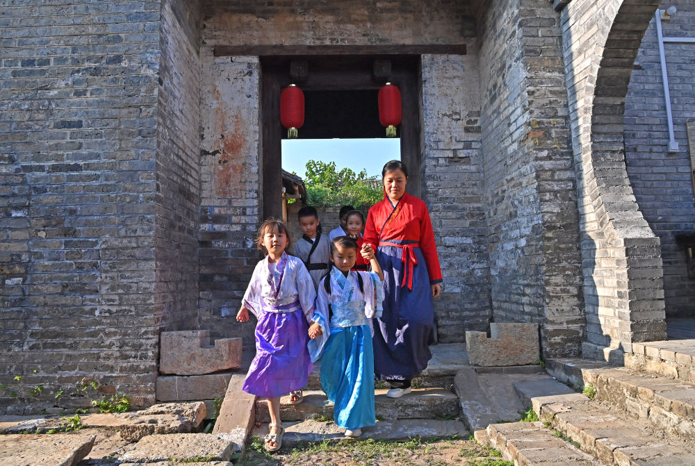 一名老師帶著幾名孩子行走在廣西來(lái)賓市象州羅秀鎮(zhèn)納祿村的古建筑群里(10月10日攝)。