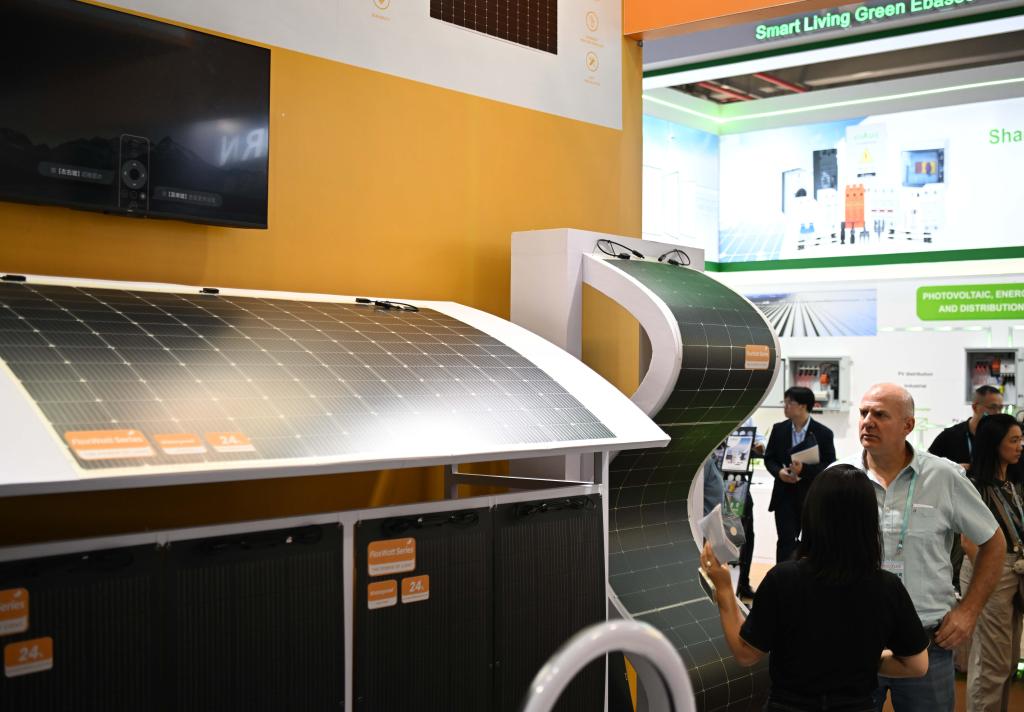 10月15日,境外采購商在太陽能光伏板企業(yè)展臺洽談。新華社記者鄧華 攝