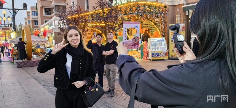除了庫爾德寧的自然景觀,伊寧市六星街、喀贊其文化旅游區(qū)也深得旅游博主吳思瑤的青睞。夜晚的六星街,當(dāng)歡快的音樂響起,各族群眾不約而同地跳了起來,看到這一幕,吳思瑤迫不及待地沖向前:“啊,我要拍……”