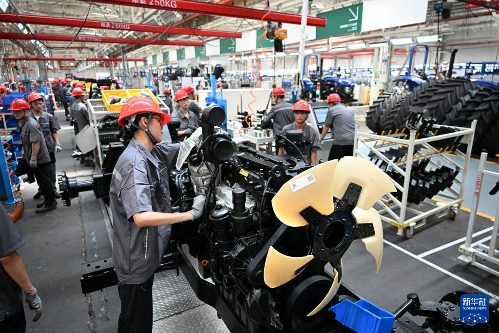 在濰柴雷沃智慧農(nóng)業(yè)科技股份有限公司拖拉機(jī)工廠總裝車間,工人在為拖拉機(jī)安裝發(fā)動機(jī)(8月21日攝)。新華社記者 李紫恒 攝