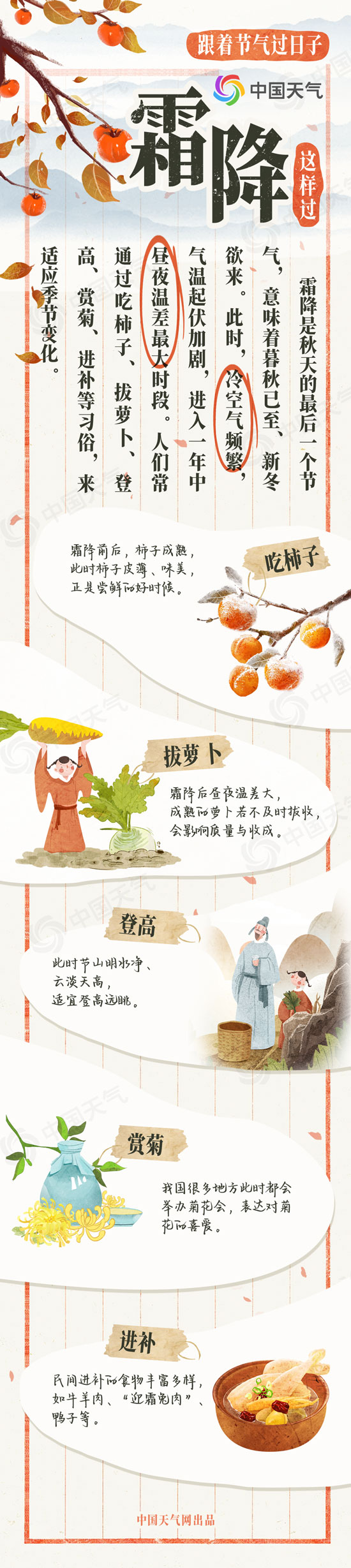 春生夏長,秋收冬藏,跟著節(jié)氣過日子。今天(10月23日)進(jìn)入秋天的最后一個(gè)節(jié)氣——霜降,意味著暮秋已至、新冬欲來。此時(shí),冷空氣頻繁,氣溫起伏加劇,進(jìn)入一年中晝夜溫差最大時(shí)段。人們常通過吃柿子、拔蘿卜、登高、賞菊、進(jìn)補(bǔ)等習(xí)俗,來適應(yīng)季節(jié)變化。中國天氣網(wǎng)特別推出霜降風(fēng)俗圖鑒和霜降全國天氣地圖,看看這個(gè)節(jié)氣怎么過。