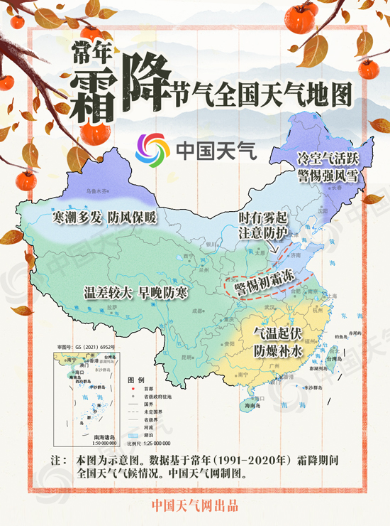 “霜降三旬后,蓂馀一葉秋。”常年霜降節(jié)氣期間,影響我國的冷空氣越來越頻繁,多地天氣由涼轉(zhuǎn)寒,晝夜溫差增大。隨著氣溫走低,冬季的地盤也開始擴(kuò)張,內(nèi)蒙古、東北大部、山西、河北北部等地往往在霜降時(shí)節(jié)步入冬季,秋天最前沿會(huì)抵達(dá)江南南部地區(qū)。