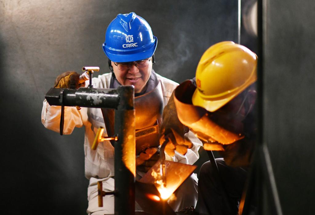 2024年2月4日,中車齊齊哈爾車輛有限公司貨車分廠電焊高級技師、高級工程師王海(左)指導徒弟焊接試件。新華社記者 王建威 攝