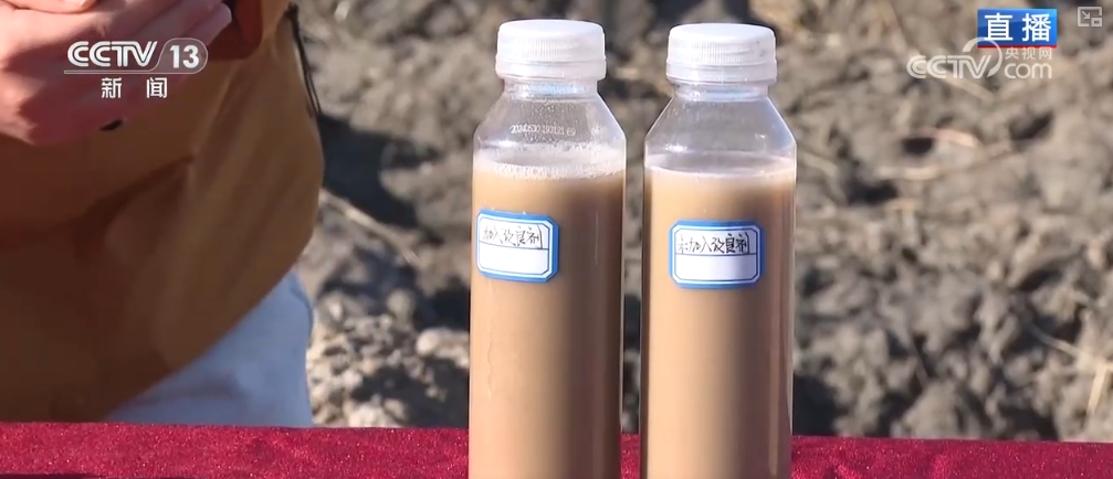 這片田采用的是有機(jī)硅改良劑來(lái)治理的鹽堿地,選取同地塊的鹽堿土溶于水中,加入有機(jī)硅后,土壤和水快速分層??梢钥吹?,有機(jī)硅具有較強(qiáng)的親土性,可以和土壤包裹一起,阻斷鹽分吸收,從而達(dá)到降堿和改變土壤板結(jié)的作用。這能讓水稻更好地扎根生長(zhǎng),渾濁的水變清澈,也可以增加作物的光合作用,有效治理重度鹽堿土壤。