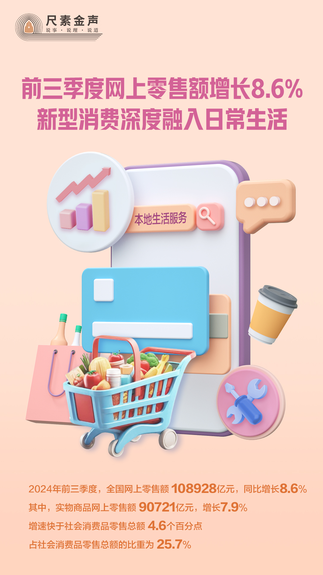 最新數(shù)據(jù)顯示,今年前三季度,全國(guó)網(wǎng)上零售額108928億元,同比增長(zhǎng)8.6%。其中,實(shí)物商品網(wǎng)上零售額90721億元,增長(zhǎng)7.9%,增速快于社會(huì)消費(fèi)品零售總額4.6個(gè)百分點(diǎn),占社會(huì)消費(fèi)品零售總額的比重為25.7%。本地生活服務(wù)等新型消費(fèi)快速增長(zhǎng),對(duì)線上消費(fèi)增長(zhǎng)起到明顯的拉動(dòng)作用。