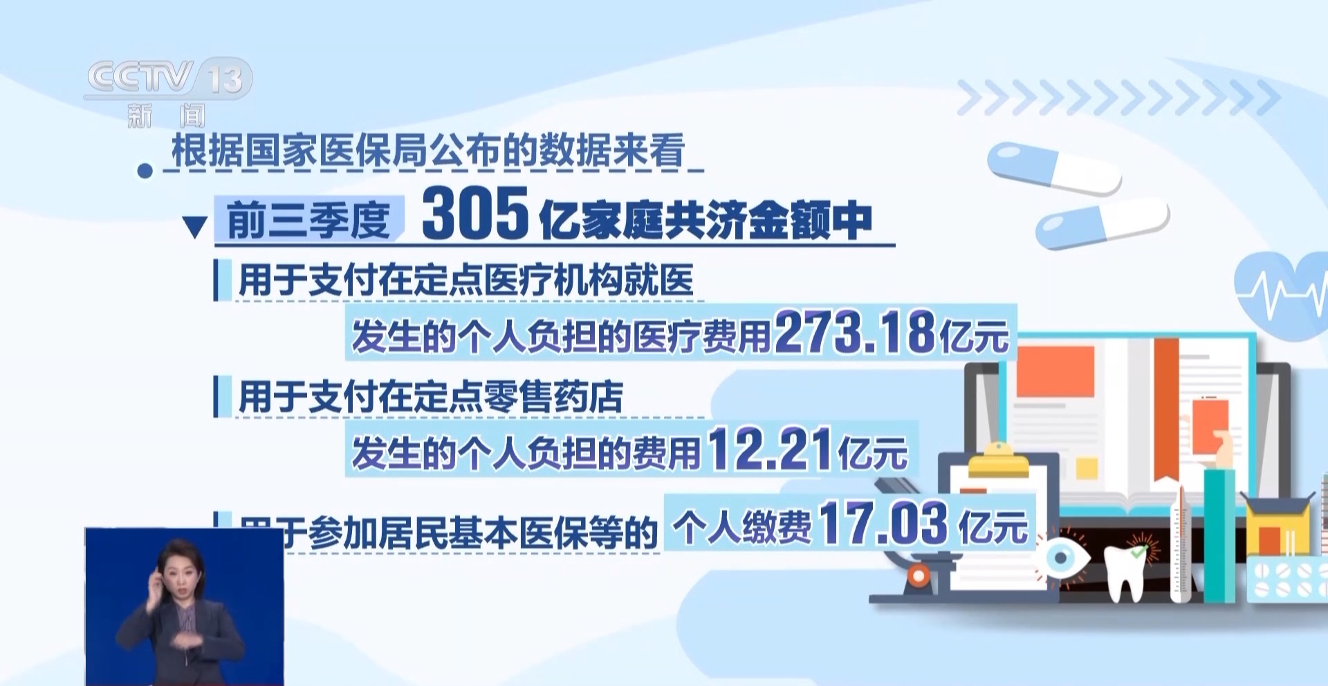 根據(jù)國(guó)家醫(yī)保局公布的數(shù)據(jù)來(lái)看,前三季度的305億家庭共濟(jì)金額中,用于支付在定點(diǎn)醫(yī)療機(jī)構(gòu)就醫(yī)發(fā)生的個(gè)人負(fù)擔(dān)的醫(yī)療費(fèi)用273.18億元,用于支付在定點(diǎn)零售藥店發(fā)生的個(gè)人負(fù)擔(dān)的費(fèi)用12.21億元,用于參加居民基本醫(yī)保等的個(gè)人繳費(fèi)17.03億元。