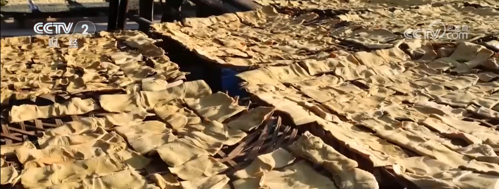 記者走進(jìn)田林縣六隆鎮(zhèn)就聞到濃濃的筍香。經(jīng)過幾個(gè)月的自然發(fā)酵,扁平、泛白的八渡筍被村民從筍倉(cāng)中取出,在陽光下自然晾曬,各家房前屋后鋪滿了金燦燦的八渡筍筍干。