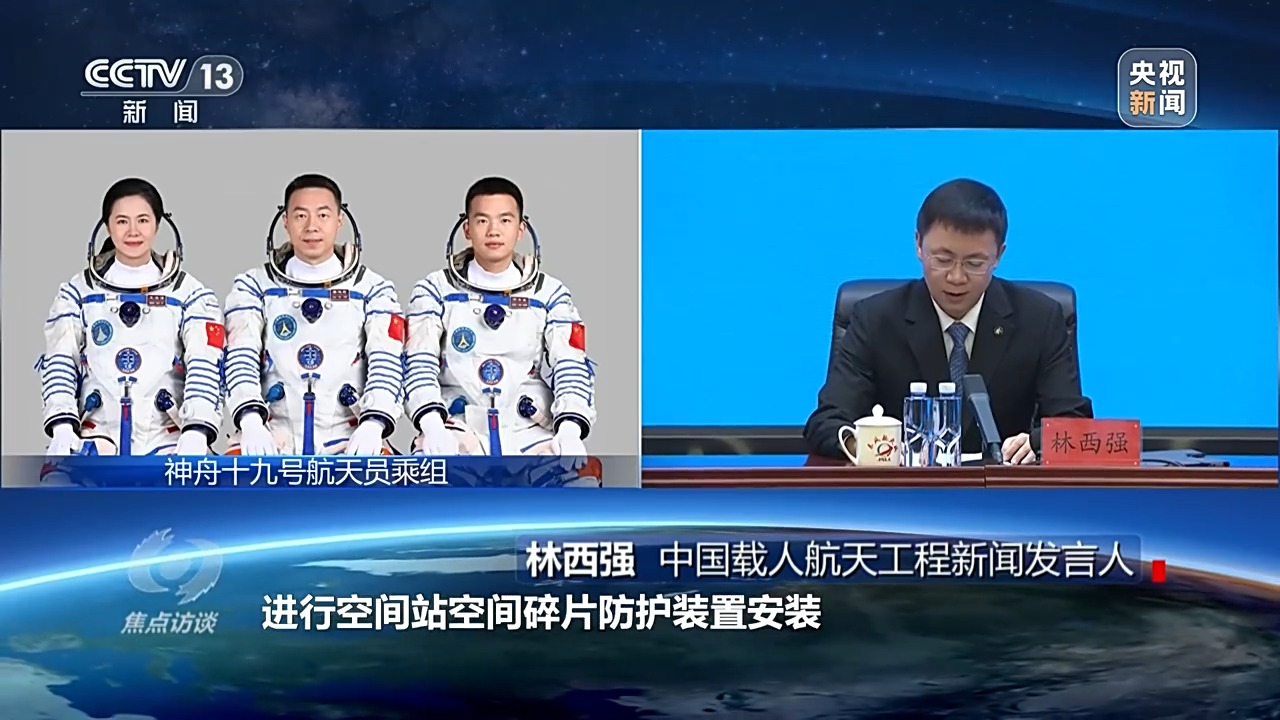 中國(guó)載人航天工程新聞發(fā)言人 林西強(qiáng):此次任務(wù)在空間站駐留約六個(gè)月,開(kāi)展空間科學(xué)與應(yīng)用實(shí)(試)驗(yàn),實(shí)施航天員出艙活動(dòng)及貨物進(jìn)出艙,進(jìn)行空間站空間碎片防護(hù)裝置安裝,艙外載荷和艙外設(shè)備安裝與回收等任務(wù),開(kāi)展科普教育和公益活動(dòng)以及空間搭載試驗(yàn)。