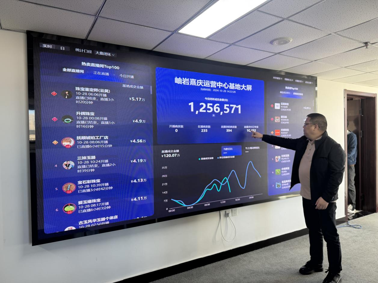 “1256571元,這是我們一上午的交易額”,岫巖熹慶運營中心的負責(zé)人指著墻上的大屏幕說:“通過這塊屏幕,不僅能實時看到各家商戶的開播、交易情況,還可以通過數(shù)據(jù)的波動及時發(fā)現(xiàn)存在的問題?!?/p>