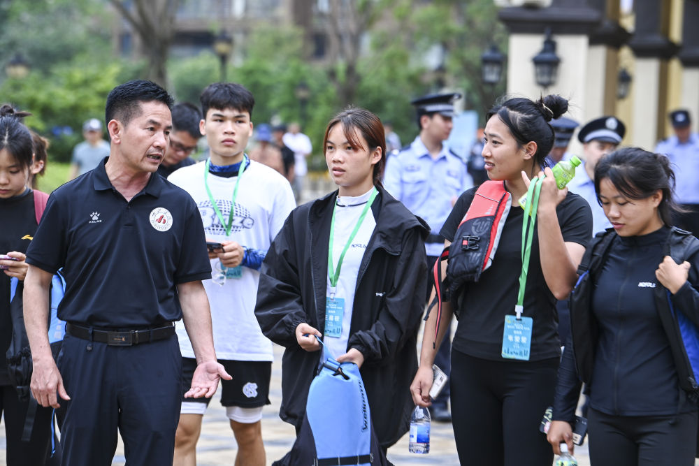 在廣西“潮動(dòng)三月三·民族體育炫”系列賽期間,藍(lán)建卓與隊(duì)員們交流。