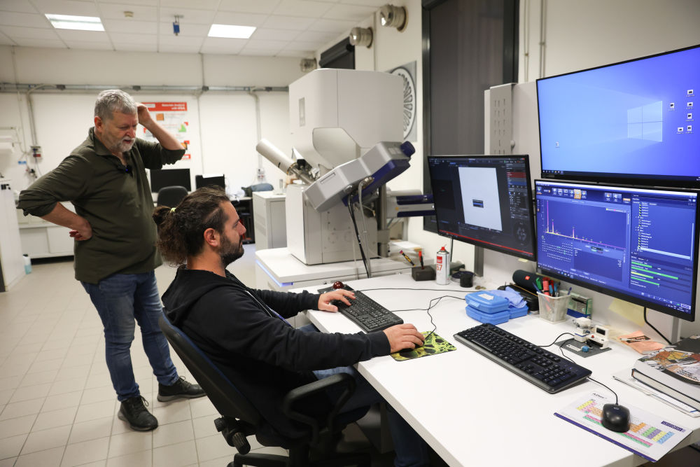 11月6日,意大利帕多瓦大學(xué)文化遺產(chǎn)學(xué)院教授馬西莫·維達萊(左)與研究人員在實驗室討論青銅獅樣本檢測分析過程。新華社記者李京攝