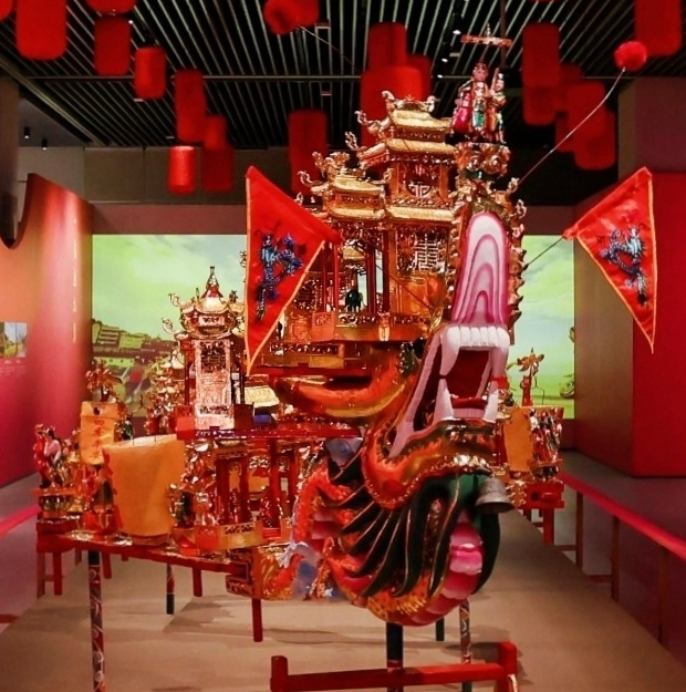 威風(fēng)凜凜,華麗無比的龍檔蜿蜒穿村而過,而領(lǐng)頭的還有一件巧奪天工的龐然大物——首飾龍。