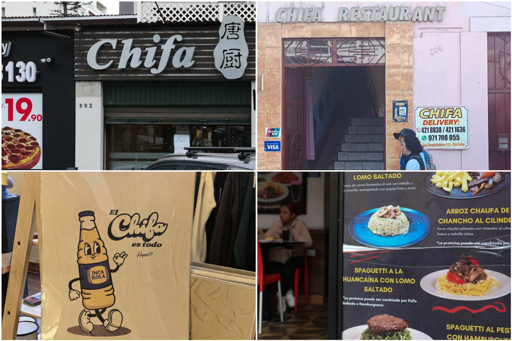 綿延不斷的人文交流,讓秘魯?shù)娘嬍硯狭嗣黠@的中餐印記:中餐館在秘魯被稱作“Chifa”(吃飯)(左上、右上)。炒飯(Chaufa)作為常規(guī)食物,登上了大多數(shù)當(dāng)?shù)夭宛^的菜單(右下)。Chifa一詞,還被利馬的年輕畫家化用為文化符號(hào),與本土飲料“印加可樂”一起融入到藝術(shù)創(chuàng)作中(左下)。