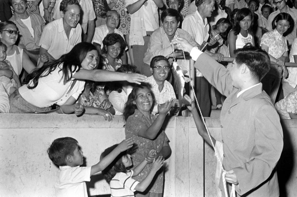 1973年2月,沈陽雜技團(tuán)赴秘魯進(jìn)行友好訪問演出。這是演員劉忠表演魔術(shù)《釣魚》,受到秘魯觀眾的熱烈歡迎。