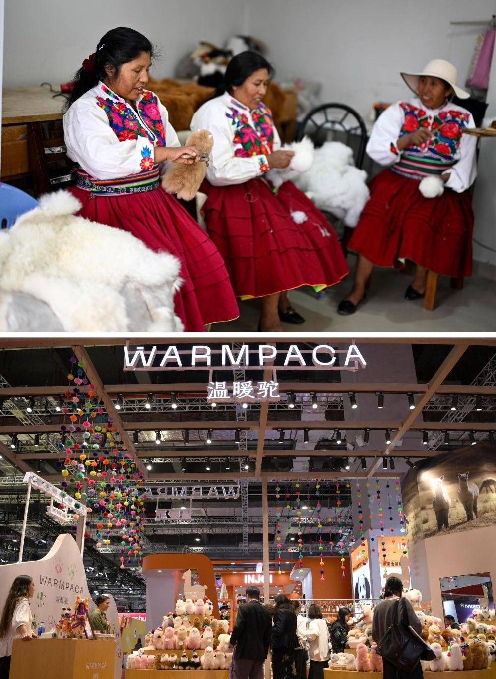 2016年,中國(guó)姑娘馬玉霞在秘魯阿雷基帕街邊市場(chǎng)購買了秘魯羊駝毛制品手工藝人奧斯瓦爾多·馬馬尼的羊駝毛玩偶并引入中國(guó)市場(chǎng)。通過連續(xù)參展進(jìn)博會(huì),羊駝毛制品在中國(guó)市場(chǎng)大受歡迎,并創(chuàng)立了中文品牌“溫暖駝”。今年,秘魯品牌“溫暖駝”連續(xù)第七年亮相進(jìn)博會(huì),受到更多中國(guó)消費(fèi)者的喜愛。目前,“溫暖駝”品牌已入駐國(guó)內(nèi)30多家商場(chǎng),并且開拓了電商平臺(tái)線上銷售,年銷量超過3萬只。上圖:2024年6月20日,在秘魯阿雷基帕,工作人員在羊駝毛制品手工藝人奧斯瓦爾多·馬馬尼的工坊制作羊駝玩偶。下圖:2024年11月5日在上海拍攝的第七屆進(jìn)博會(huì)秘魯“溫暖駝”展臺(tái)。