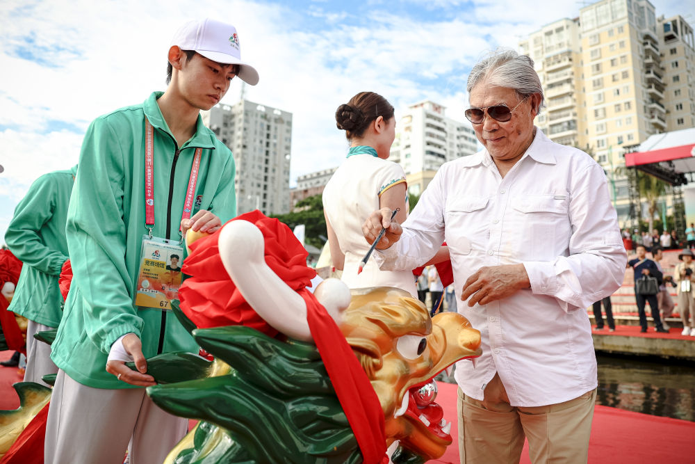 11月23日,中國(guó)香港體育協(xié)會(huì)暨奧林匹克委員會(huì)會(huì)長(zhǎng)霍震霆(右一)在賽前儀式上為龍舟“點(diǎn)睛”。新華社記者 江漢 攝