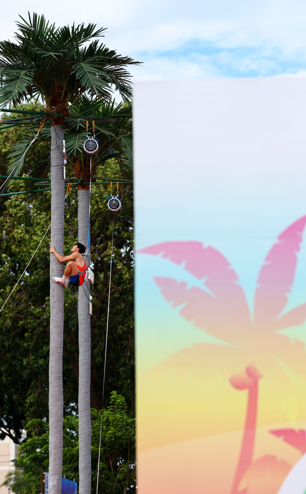 相比在運(yùn)動(dòng)會(huì)上歷史悠久的龍舟,當(dāng)日上演的攀椰競(jìng)速則是在本屆賽事首次撞入人們的眼簾。在椰子樹(shù)上手腳并用攀爬,迅速抵達(dá)頂端,不問(wèn)可知,這一競(jìng)技性與趣味性兼具的運(yùn)動(dòng)脫胎于海南當(dāng)?shù)厝罕妭鹘y(tǒng)的徒手爬樹(shù)摘椰子場(chǎng)景。