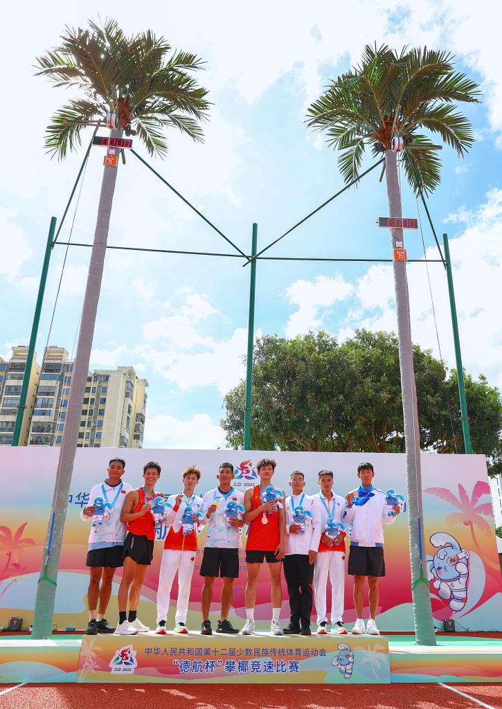 11月24日,獲獎選手在頒獎儀式上合影。當(dāng)日,第十二屆全國少數(shù)民族傳統(tǒng)體育運(yùn)動會攀椰競速男子9米決賽在西南大學(xué)三亞中學(xué)體育場舉行。新華社記者 楊植森 攝
