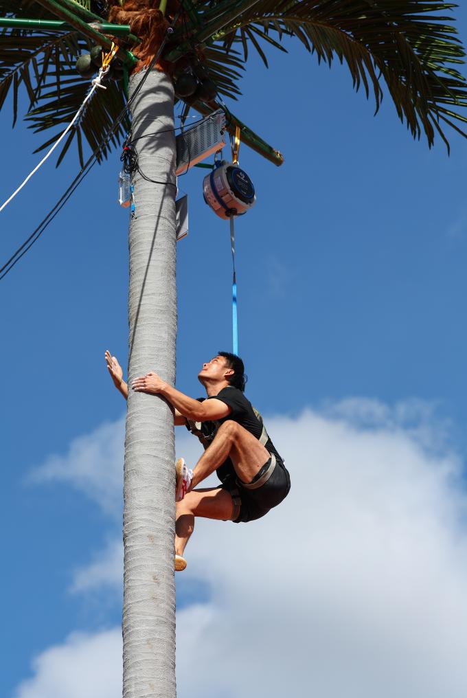 這項(xiàng)起源于海南群眾摘椰勞作的比賽既像沒有巖點(diǎn)的速度攀巖,又像垂直騰躍的跑酷。比賽中,運(yùn)動(dòng)員在9米(女子7米)的人造椰樹上攀爬,“樹干”筆直,六七秒之間便已決出勝負(fù),扣人心弦的比賽令觀眾發(fā)出潮水般的歡呼。