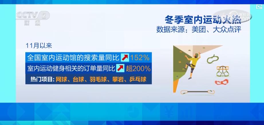 數(shù)據(jù)顯示,11月以來,全國室內(nèi)運(yùn)動(dòng)館的搜索量同比增長152%,與室內(nèi)運(yùn)動(dòng)健身相關(guān)的訂單量同比增長超200%,網(wǎng)球、臺(tái)球、羽毛球、攀巖、乒乓球是其中的熱門項(xiàng)目。