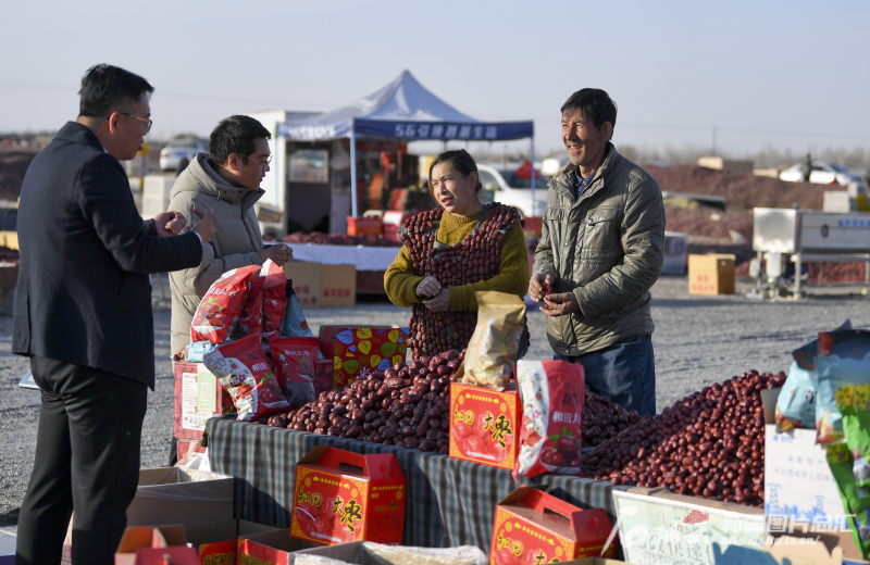 11月29日,策勒縣智慧果業(yè)農(nóng)民專業(yè)合作社員工在直播銷售大棗。