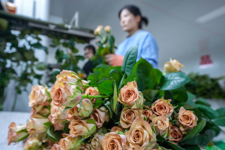 2024年8月23日,在云南晉寧花卉產(chǎn)業(yè)現(xiàn)代化示范園采后處理中心,花農(nóng)將鮮切花放入自動分揀流水線上進(jìn)行分揀。新華社記者 陳欣波 攝