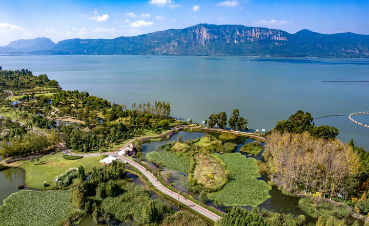 這是2024年10月18日拍攝的云南省昆明市滇池及星海半島濕地公園(無人機(jī)照片)。新華社記者 陳欣波 攝