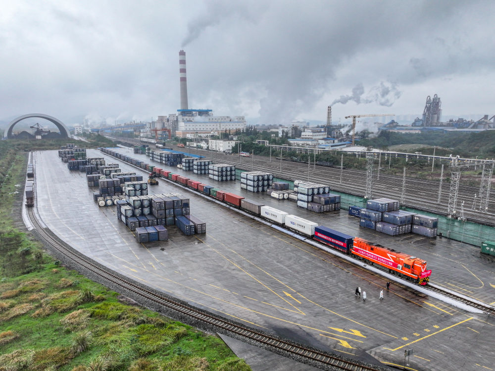 11月19日,重慶市動(dòng)力鋰電池全國(guó)鐵路試運(yùn)首發(fā)班列在重慶長(zhǎng)壽渝巴專用鐵路等待發(fā)車。新華社記者 唐奕 攝