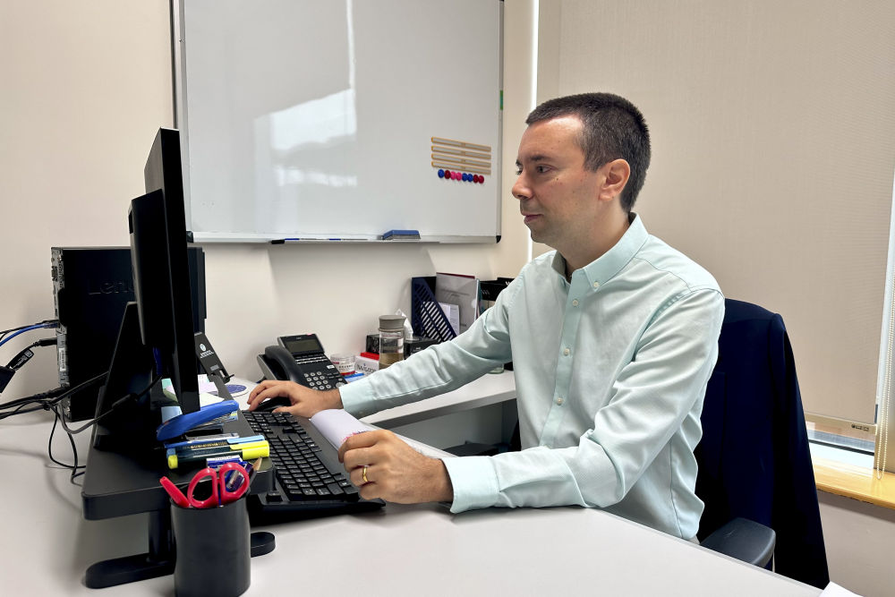 2024年11月21日,澳門城市大學(xué)葡語國家研究院的助理教授、來自葡萄牙的若昂·西蒙斯(中文名朱奧)在辦工室工作。新華社記者 王露 攝