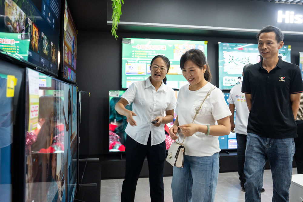 在湖南省岳陽市汨羅市屈子祠鎮(zhèn)雙楚村,彭坤、彭建華夫婦家中有一臺(tái)使用了近十年的32英寸液晶電視機(jī)。今年,在以舊換新政策的吸引下,他們決定更換一臺(tái)更大更好的電視機(jī)。根據(jù)實(shí)際需求和個(gè)人喜好,在反復(fù)對(duì)比后,他們換購了一臺(tái)75英寸的新款液晶電視機(jī)。舊電視在新機(jī)送貨上門時(shí)被當(dāng)場(chǎng)回收,疊加各種補(bǔ)貼后,實(shí)際成交價(jià)較廠商定價(jià)優(yōu)惠了近30%。(新華社記者 陳思汗 攝)