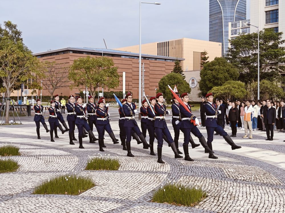 “正步走!”早晨八點,曙光照拂澳大蓮花廣場,身著海軍藍(lán)制服的學(xué)生邁著鏗鏘有力的步伐走向升旗臺。國歌響起,五星紅旗在澳門特區(qū)區(qū)旗和澳門大學(xué)校旗映襯下,冉冉升起,迎風(fēng)招展。