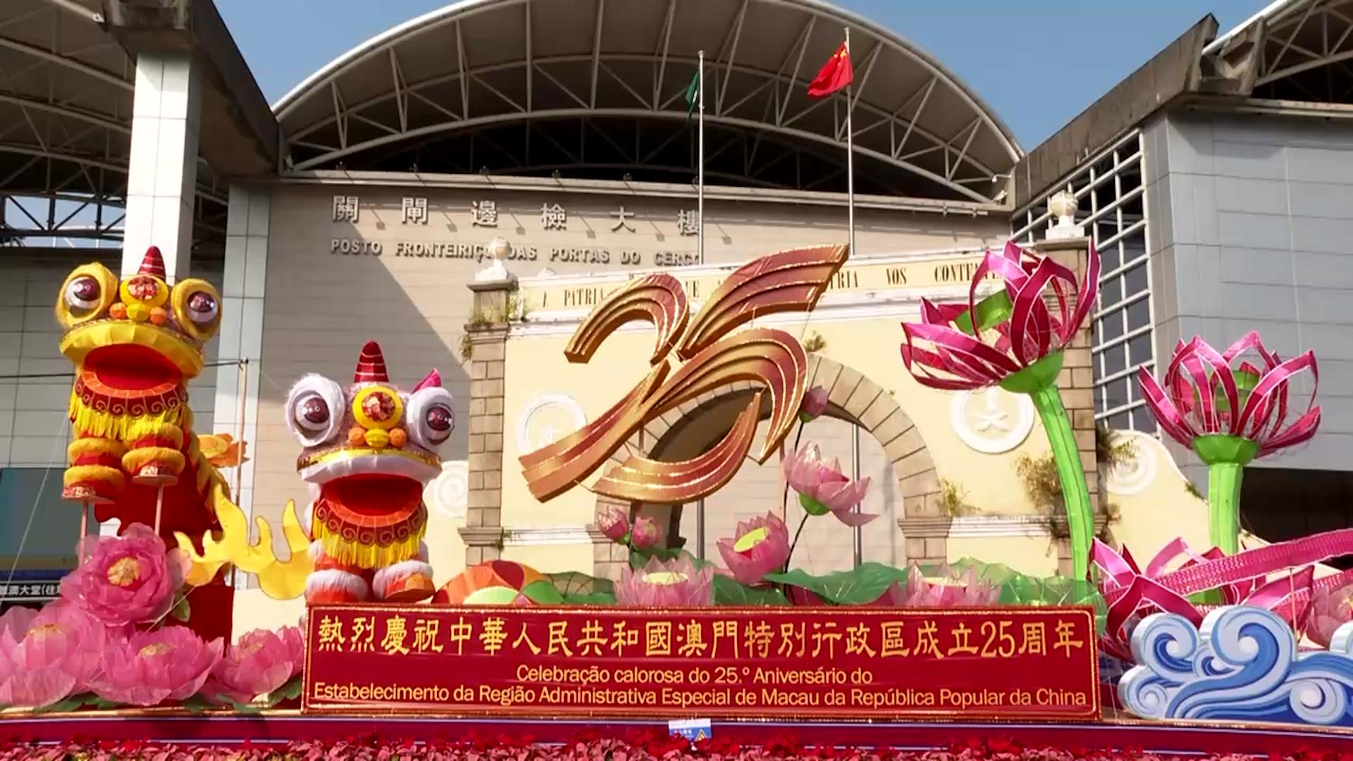 鮮艷的五星紅旗和澳門特區(qū)區(qū)旗迎風(fēng)飄揚