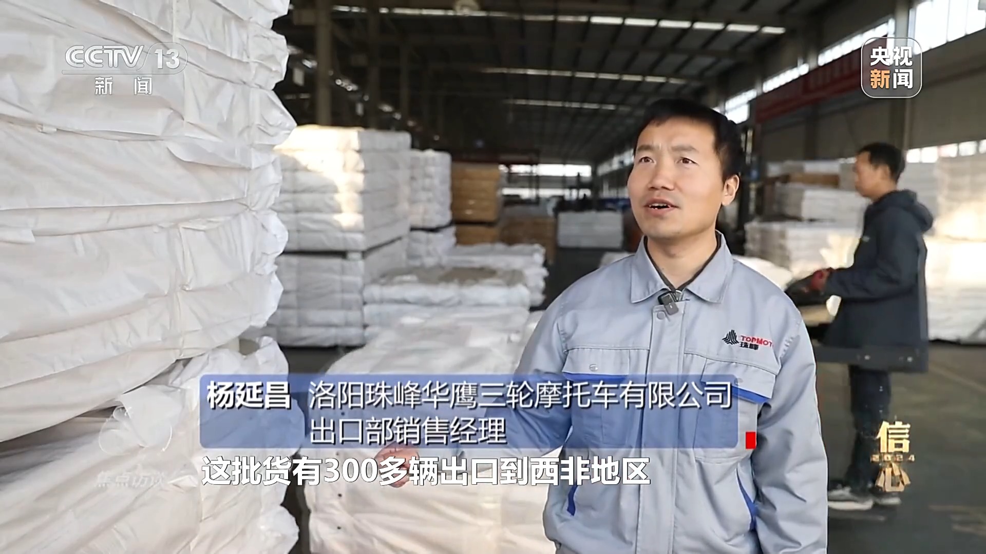 洛陽珠峰華鷹三輪摩托車有限公司出口部銷售經(jīng)理 楊延昌:“這批貨有300多輛出口到西非地區(qū),目前訂單量已經(jīng)達(dá)到了3萬臺,排到了25年3月份?!?/p>