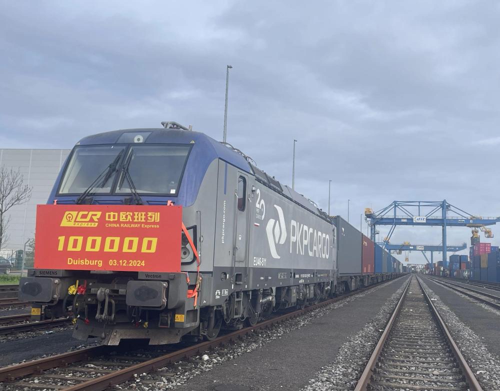 這是2024年12月3日在德國(guó)杜伊斯堡市DIT場(chǎng)站拍攝的第10萬列中歐班列。新華社 朱璇 攝