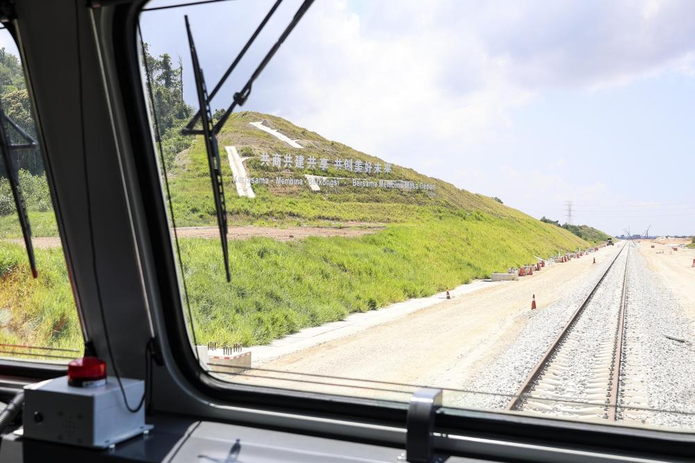 2024年5月6日,在馬來西亞彭亨州馬東鐵項(xiàng)目沿途的山坡上,兩行中文和馬來文大字“共商共建共享,共創(chuàng)美好未來”映入眼簾。新華社記者 程一恒 攝
