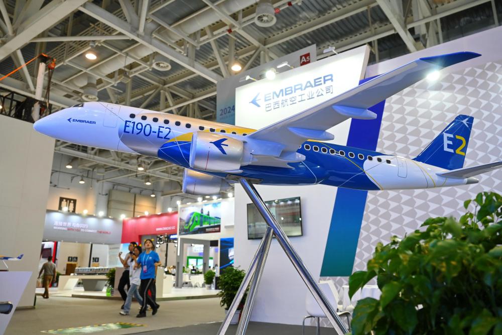 這是在廈門舉行的2024金磚國(guó)家新工業(yè)革命展巴西展位展出的E190-E2飛機(jī)模型(2024年9月10日攝)。新華社記者 林善傳 攝