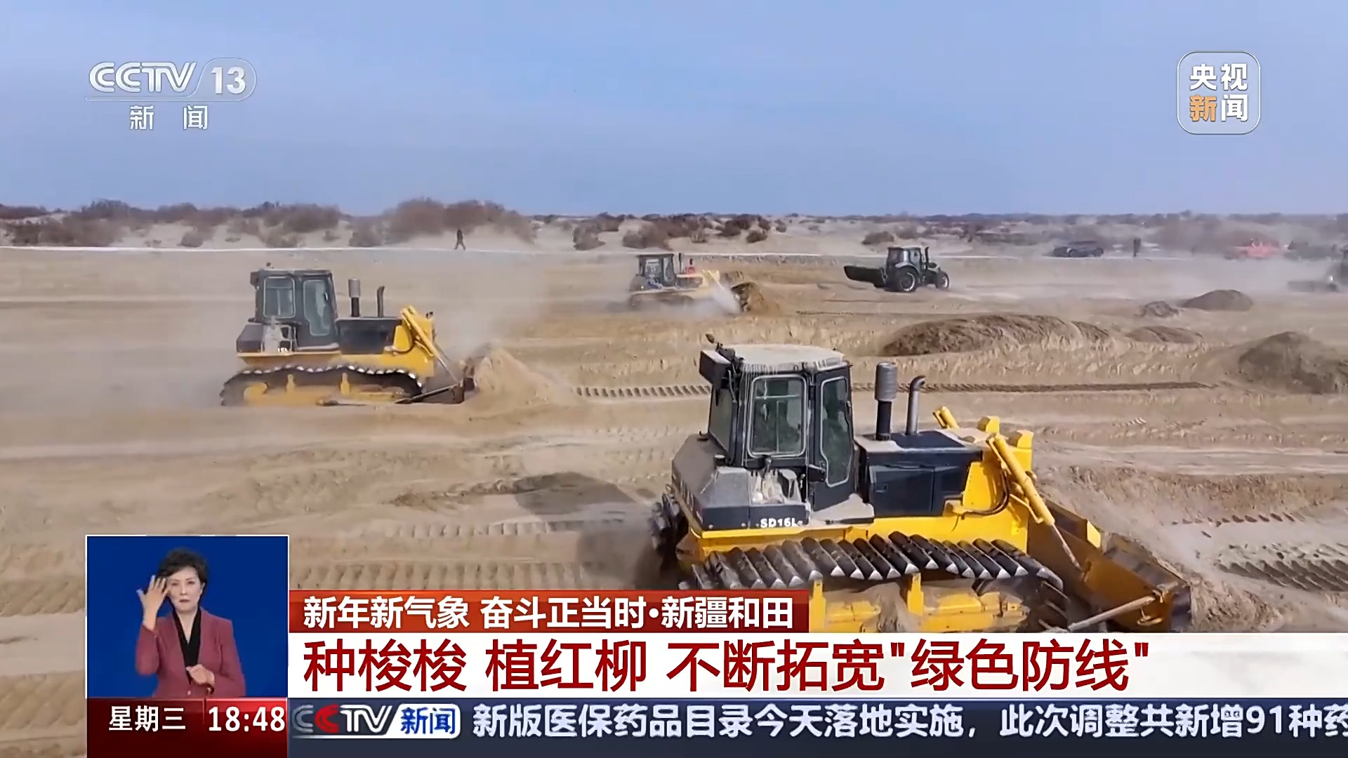 總臺記者 高鵬飛:這里是塔克拉瑪干沙漠南緣的和田于田縣,這兩天沙漠里面迎來了一場降雪,這會氣溫在零下10℃左右,非常寒冷,但是,在我旁邊就是一處熱火朝天的沙漠治沙現場。