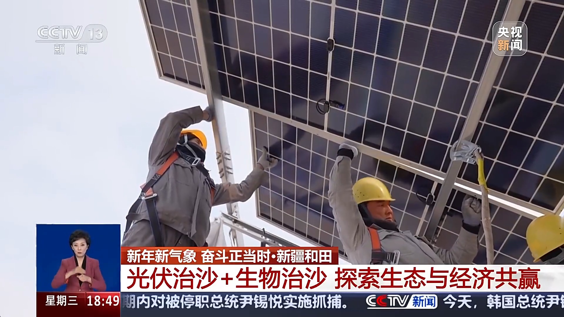 除了為生物治沙作準備,塔克拉瑪干沙漠中還有不少光伏項目正在建設,工人們加緊鋪設光伏板,到春天,光伏板下還會種上苜蓿、狼尾草等固沙植物,這處包含光伏治沙、生物治沙的鎖邊工程拓寬項目,也將成為新疆探索生態(tài)治理與經濟發(fā)展共贏的一個新模式。