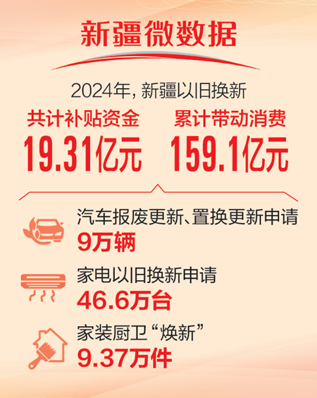 數(shù)據(jù)顯示,截至12月31日,2024年全疆范圍內(nèi)提交汽車報(bào)廢更新、汽車置換更新申請(qǐng)共計(jì)9萬輛,家電以舊換新申請(qǐng)46.6萬臺(tái),家裝廚衛(wèi)“煥新”達(dá)9.37萬件。此外,電動(dòng)自行車以舊換新數(shù)量達(dá)3.32萬輛。這些數(shù)據(jù)的背后,是新疆消費(fèi)者對(duì)高品質(zhì)生活的追求和對(duì)環(huán)保理念的積極踐行。