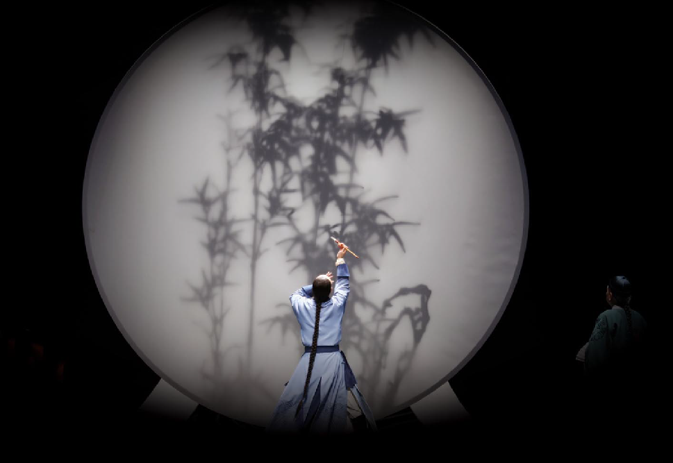 舞臺(tái)上,古琴與琵琶的悠揚(yáng)旋律仿若一陣清風(fēng),輕輕拂開歷史的畫卷,清代揚(yáng)州的風(fēng)情萬種如詩(shī)如畫般徐徐展開。鄭板橋筆下的竹、蘭、石化作他性格的三種特質(zhì),生動(dòng)地展現(xiàn)了為官之德、書生之質(zhì)、為民之心,以及他對(duì)生命價(jià)值的執(zhí)著堅(jiān)守,深深地震撼著每一位觀者的心靈,讓他們沉浸其中,心潮澎湃。